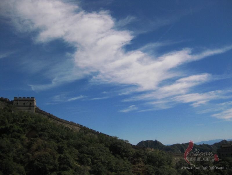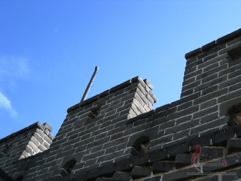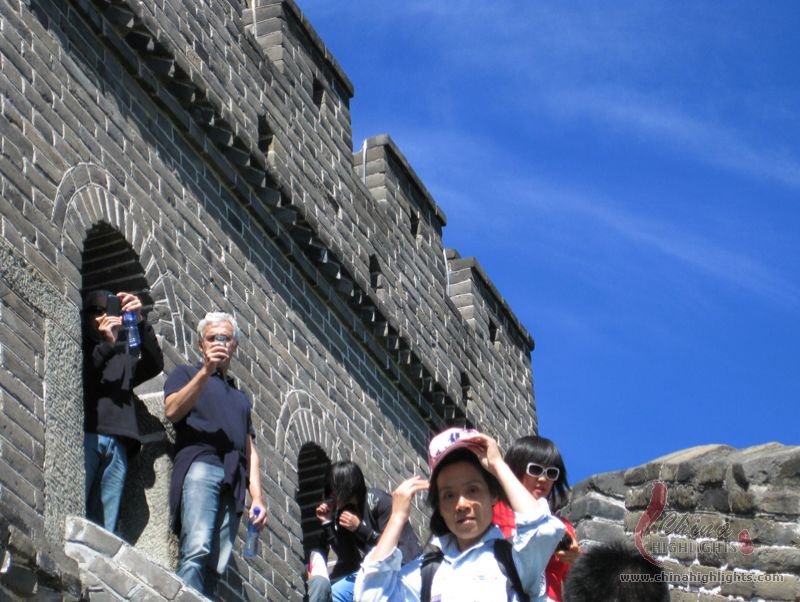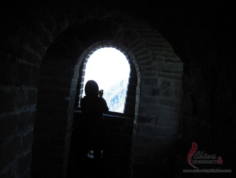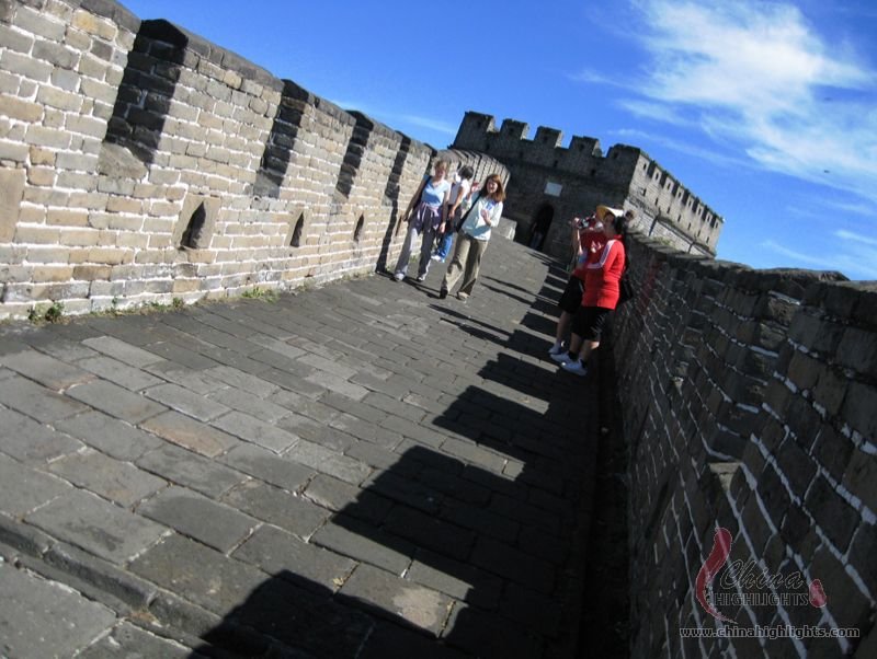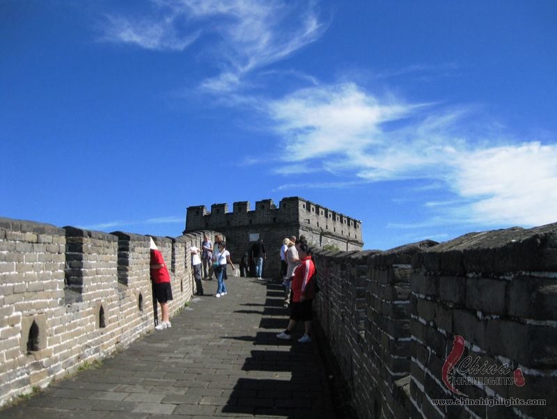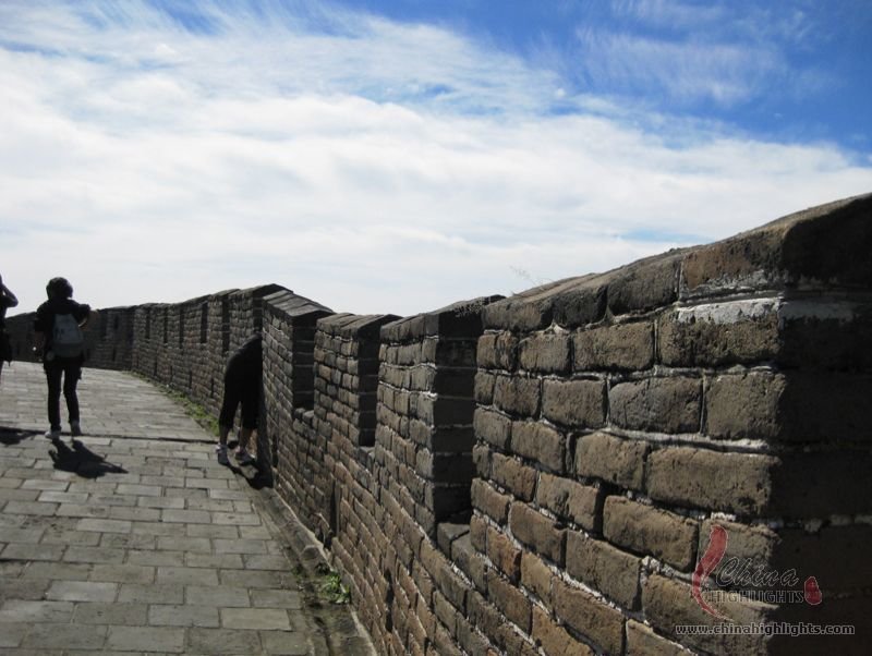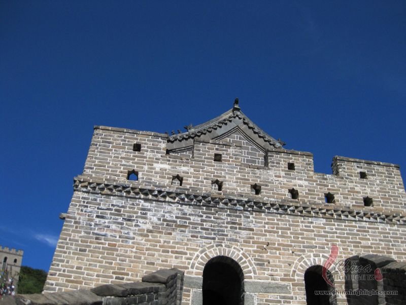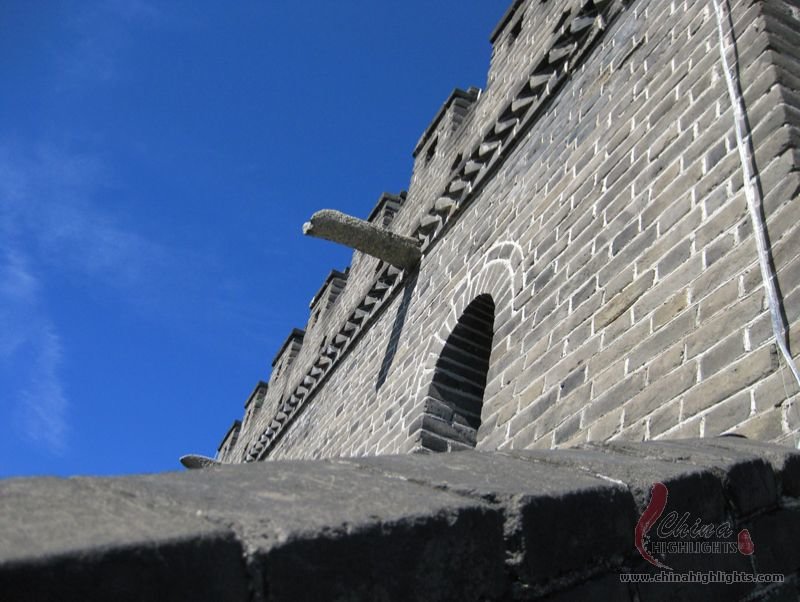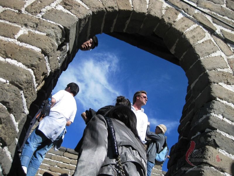 The Great Wall we see today mostly dates back to the Ming Dynasty. The best-preserved and most imposing section is at Badaling in Beijing. The section, located outside the Juyongguan Pass, is made of large blue bricks and has an average height of 7.8 meters. Five to six horses can be ridden abreast along it. At regular intervals there is an arched door leading to the top of the wall. The walls are covered with many lookout holes, window embrasures and castellated crenels. Beacon towers were also built at fixed intervals for passing on military information. All these indicate the important role of the Great Wall in military defense.