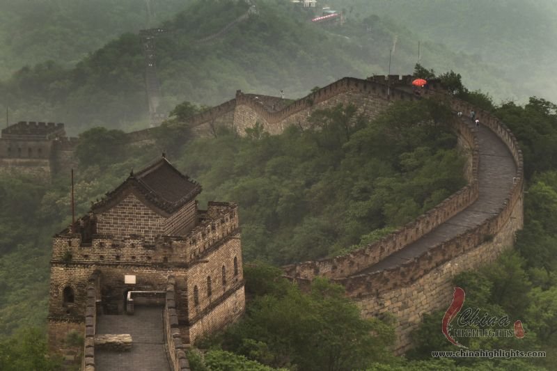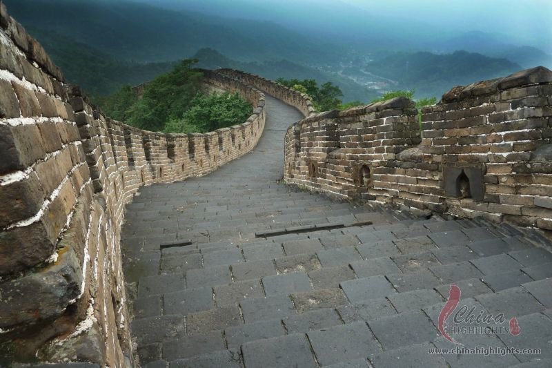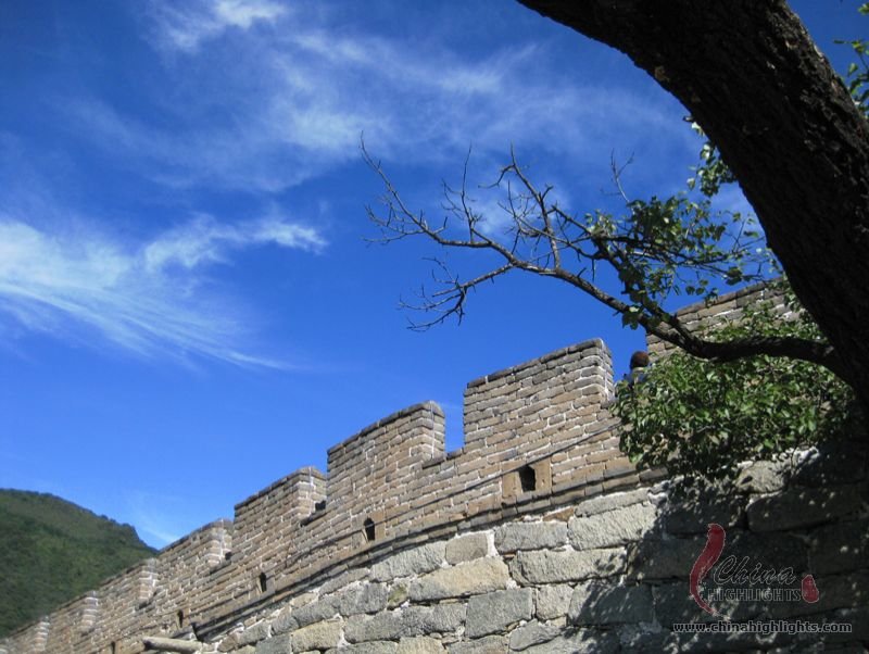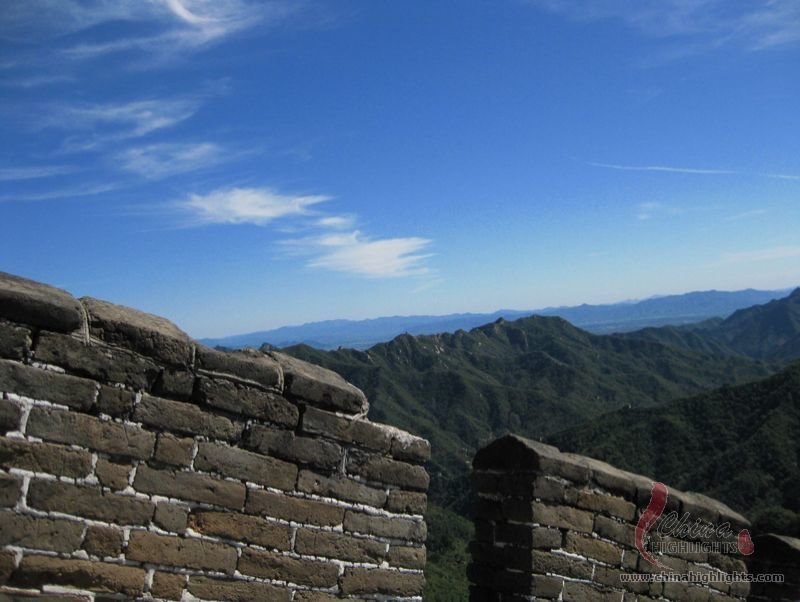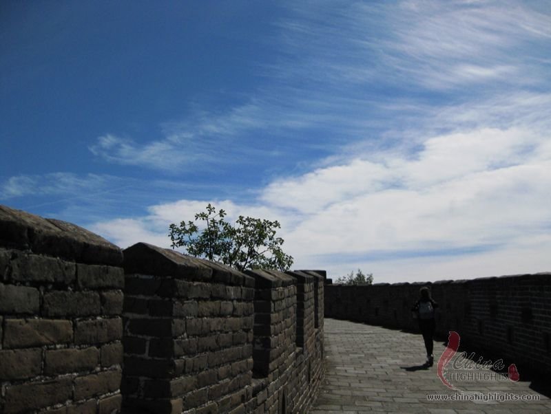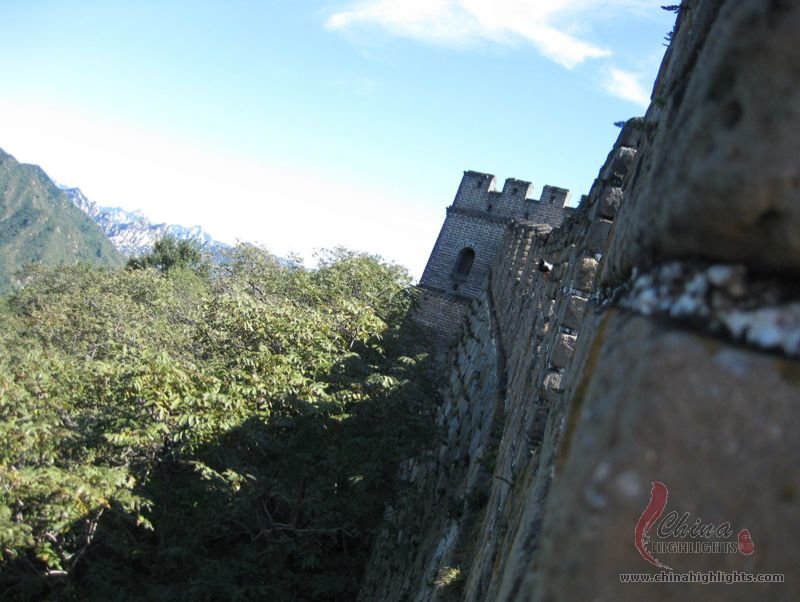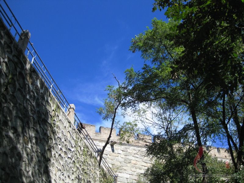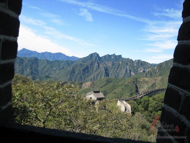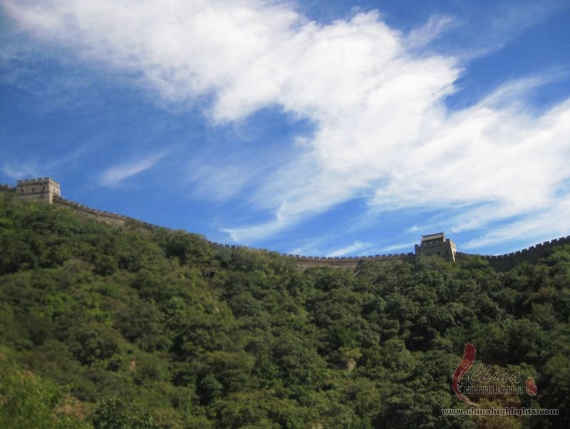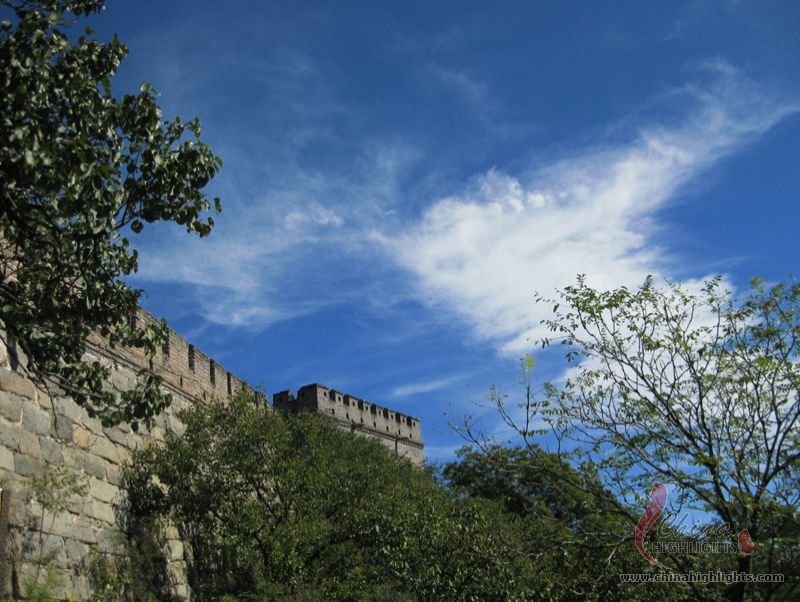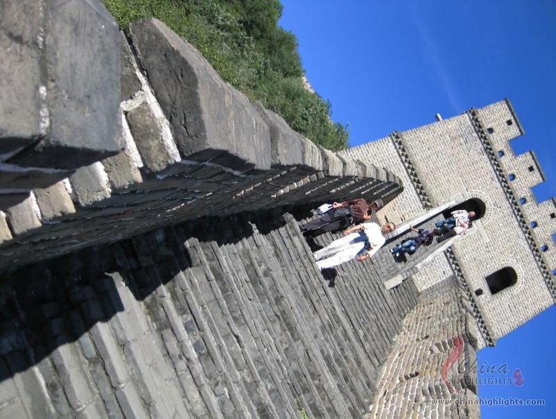 The Great Wall we see today mostly dates back to the Ming Dynasty. The best-preserved and most imposing section is at Badaling in Beijing. The section, located outside the Juyongguan Pass, is made of large blue bricks and has an average height of 7.8 meters. Five to six horses can be ridden abreast along it. At regular intervals there is an arched door leading to the top of the wall. The walls are covered with many lookout holes, window embrasures and castellated crenels. Beacon towers were also built at fixed intervals for passing on military information. All these indicate the important role of the Great Wall in military defense.