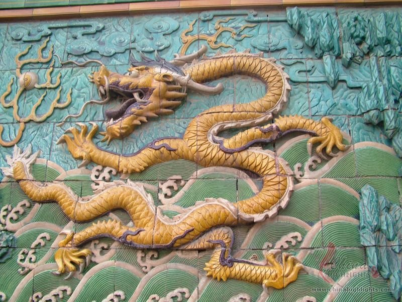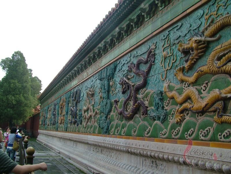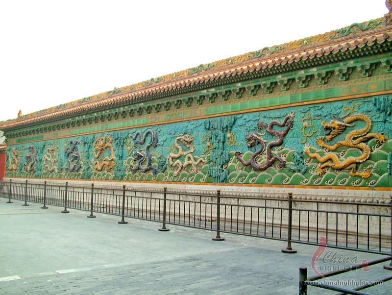 - Nine Dragon ScreenComposed of 270 glazed tiles, it depicts nine writhing dragons playing with pearls against a background of the sea and clouds.